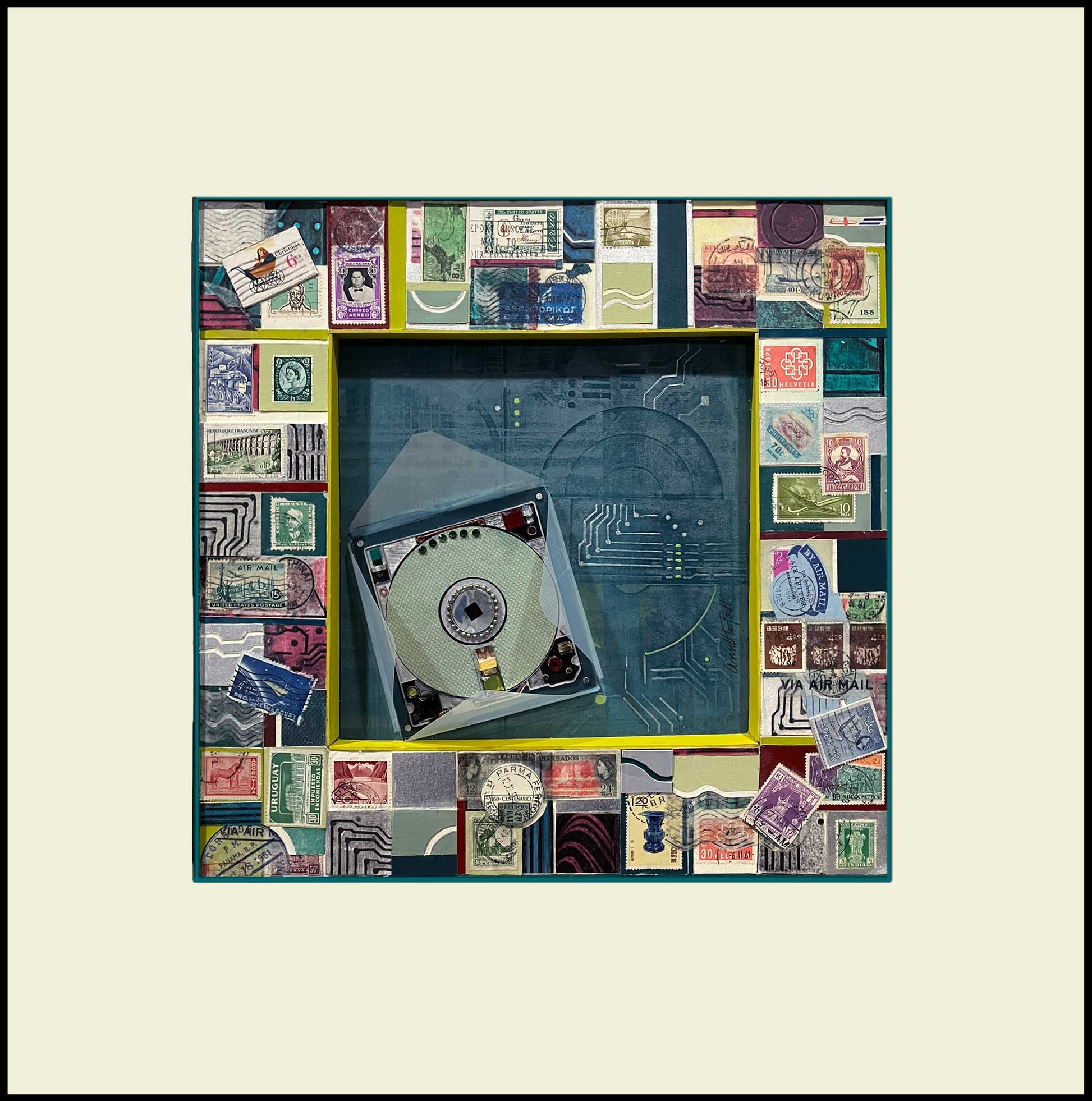 Having experienced the influx of technology in our world, I have appreciated how much easier it has made many otherwise arduous tasks, and been awed by the engineering science behind it all. The images in this assemblage are symbolic of the change in how we communicate, from the wait on the postal delivery system to the immediate contact and response of email. Here, lines and shapes reflect the patterns that power the electronics of today and the arrangement of vintage postal stamps give a nod to abstract artists like Mondrian whose geometric shapes and patterns were a turning point in the art movement.