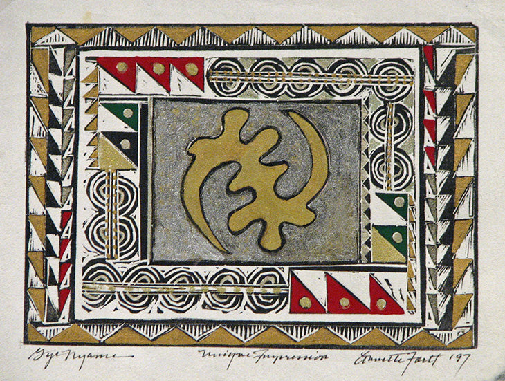 The Adinkra language of Ghana West Africa is a symbolic language, originally used on cloth, to express certain social and spiritual beliefs. This hand pulled, hand painted image is one of a series of unique impressions created from the block which was originally designed for greeting cards. This symbol means fear God.
