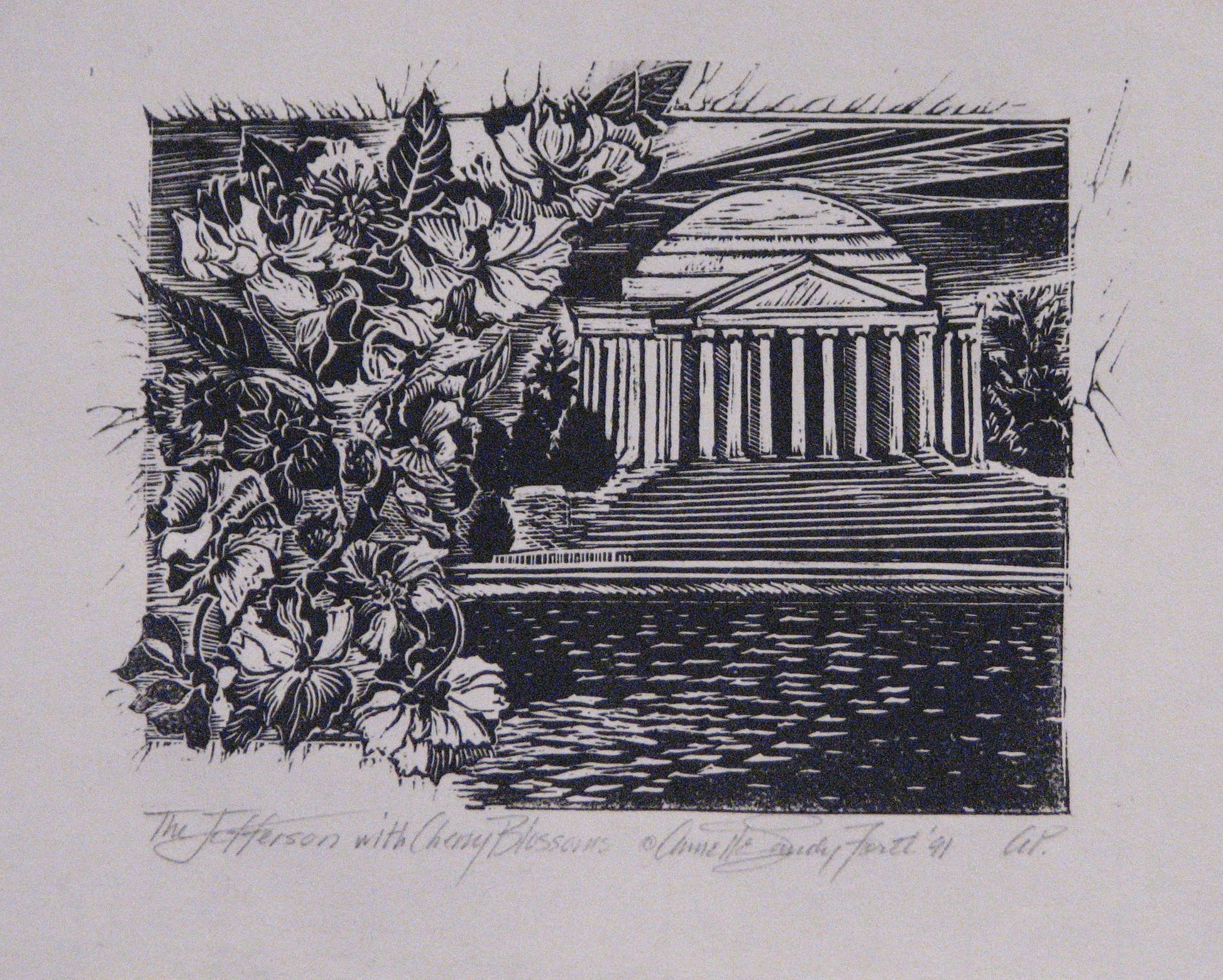 This linocut is the smaller of the series of four, not because it is less impressive but because the simplicity of design lends itself more easily to that format. For each of the four monuments I chose to include a flower that is found in the surrounding gardens. Because the Jefferson monument is so beautifully enhanced when they come into bloom, I chose the include them in the composition.