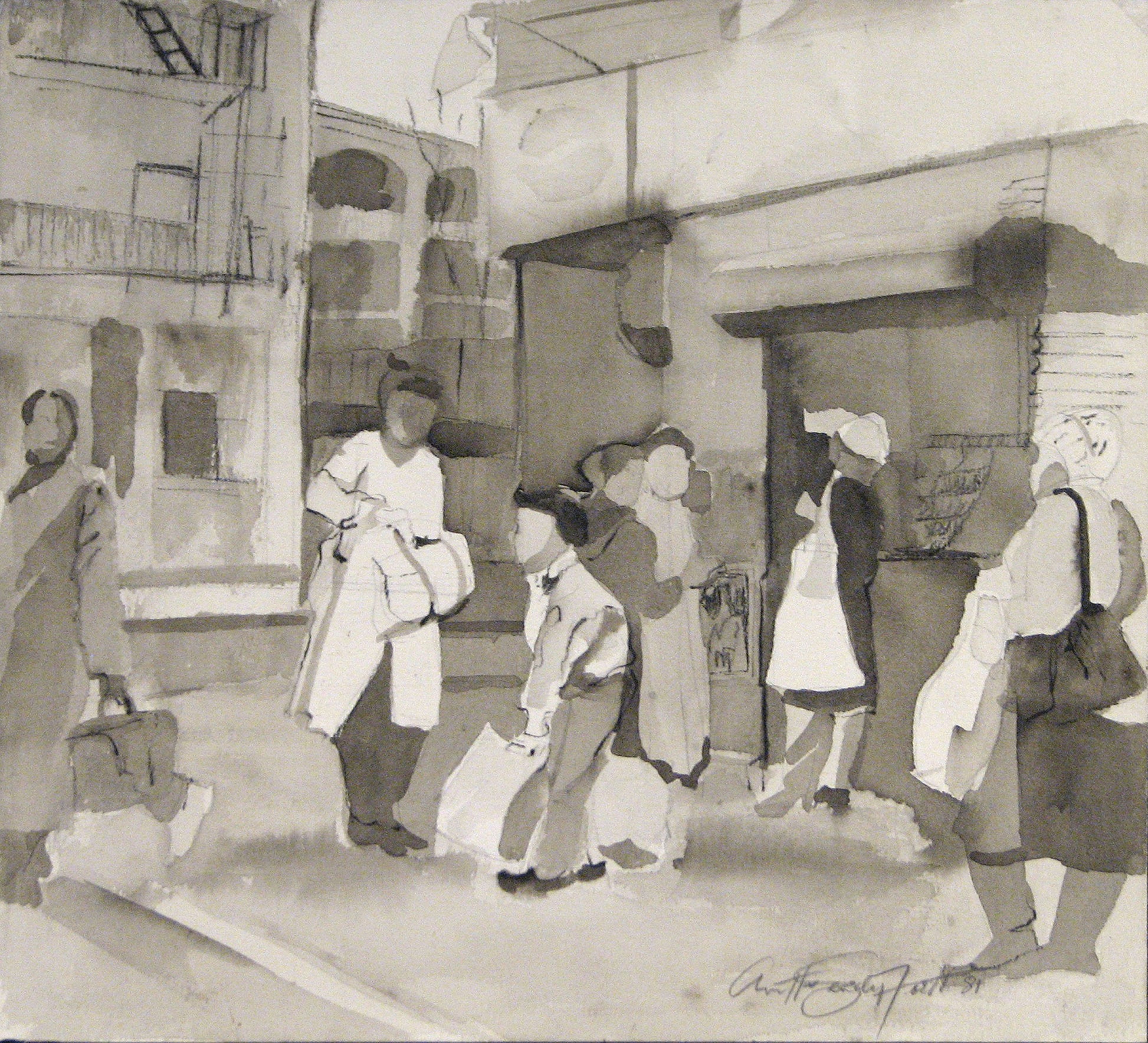 To school, to work, to open shop - all are obvious in this candid shot of everyday life in Brooklyn New York which was my inspiration for this one of several ink and charcoal drawings of everyday life the New York in the 80's.